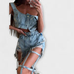 Gaia - Štýlový svetlomodrý denimový crop top s detailmi na ramienkach a roztrhnutými šortkami